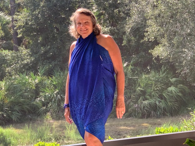 We may put on more public clothes for our trips to the supermarket, and we may don nice clothes (at least from the waist up) for our Zoom sessions. Personally, I have said “So long!” to restrictive clothes and said “Hello!” to sarongs. I purchased my first green wrap (also know as a pareo in Tahitian or a shmatah in Yiddish) in Jamaica to wrap around my bathing suit when heading to the resort beach. I now own about ten in different colors and fabrics. They are light, versatile and perfect for Florida’s heat and humidity. Larry has even purchased a men’s mini version. Dinners on our lanai (Florida for covered porch) wouldn’t be the same without our strategically knotted wraps with Radio Margaritaville playing in the background