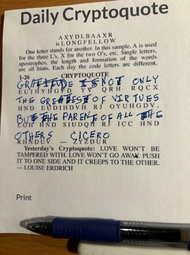 The minute I am finished—or have given up—I immediately dive into my Cryptoquote. Most of the time, I work through it quickly. There are nights when I don’t go to bed until I can figure it out. When I get desperate, I ask Larry for a hint. (“Is the third letter in the first word an ‘e’?). He consults the online solution and provides the clue.